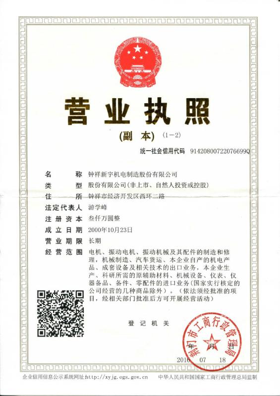 鐘祥新宇機(jī)電制造股份有限公司前身是鐘祥電機(jī)廠,1968年 籌建工廠,原機(jī)電部確認(rèn)為定點(diǎn)生產(chǎn)中小型電機(jī)的專(zhuān)業(yè)廠家。于2014年09月24日由“鐘祥新宇機(jī)電制造有限公司”變更名為“鐘祥新宇機(jī)電制造股份有限公司”。主要生產(chǎn)各類(lèi)振動(dòng)電機(jī)、振動(dòng)機(jī)械、輸送機(jī)械。是中國(guó)電器工業(yè)協(xié)會(huì)中小型電機(jī)分會(huì)理事單位、中國(guó)重型機(jī)械工業(yè)協(xié)會(huì)洗選設(shè)備專(zhuān)業(yè)委員會(huì)理事單位,是中國(guó)大型的振動(dòng)電機(jī)生產(chǎn)廠家。